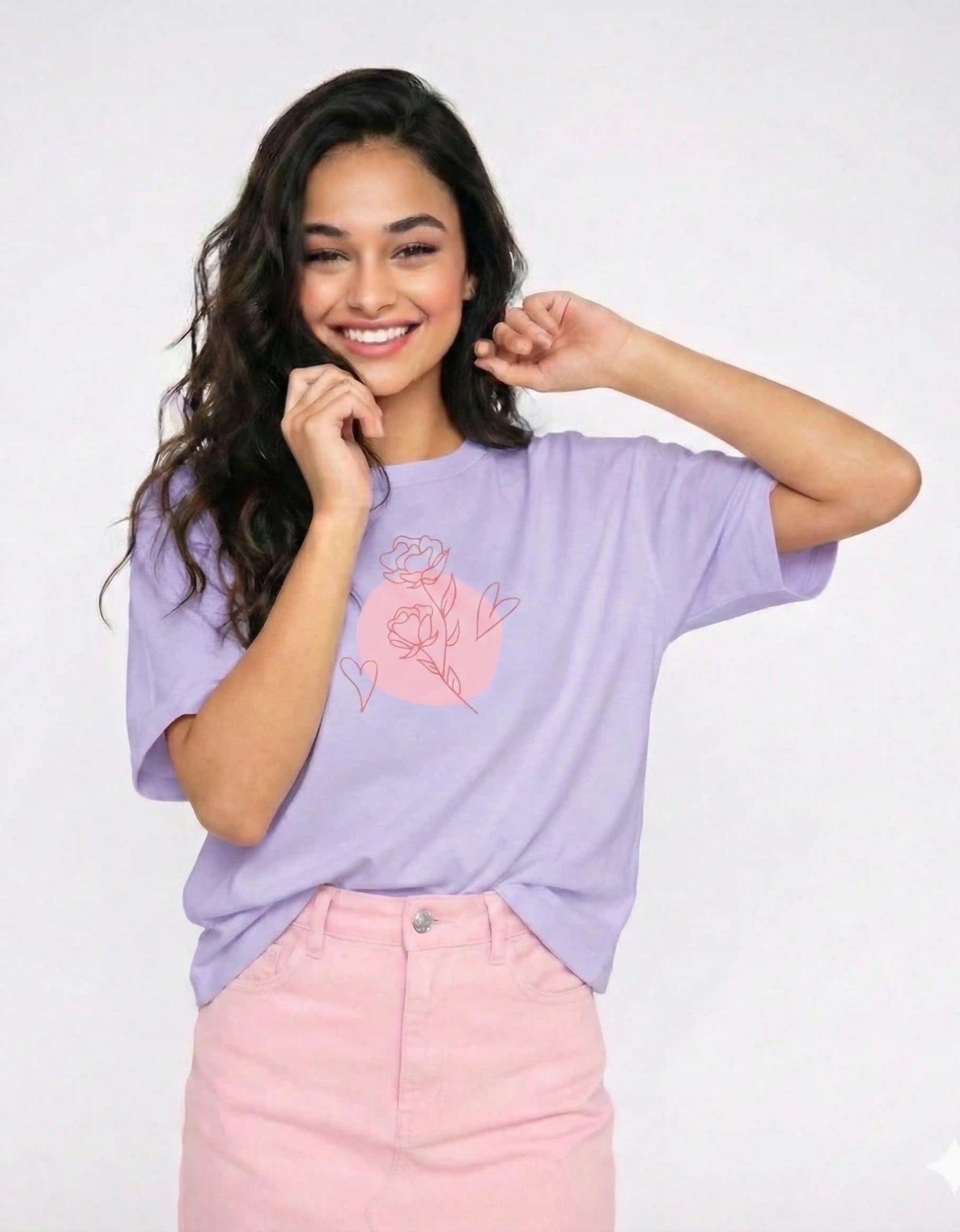 Oversized T-shirt made from 100% cotton, 240 GSM, offering a heavyweight feel while remaining breathable. Designed with a soft oversized silhouette, this tee features a delicate floral line-art graphic set against a blush-toned heart, symbolizing love in full bloom. The round neckline, dropped shoulders, and relaxed drape make it an effortless choice for romantic everyday styling.