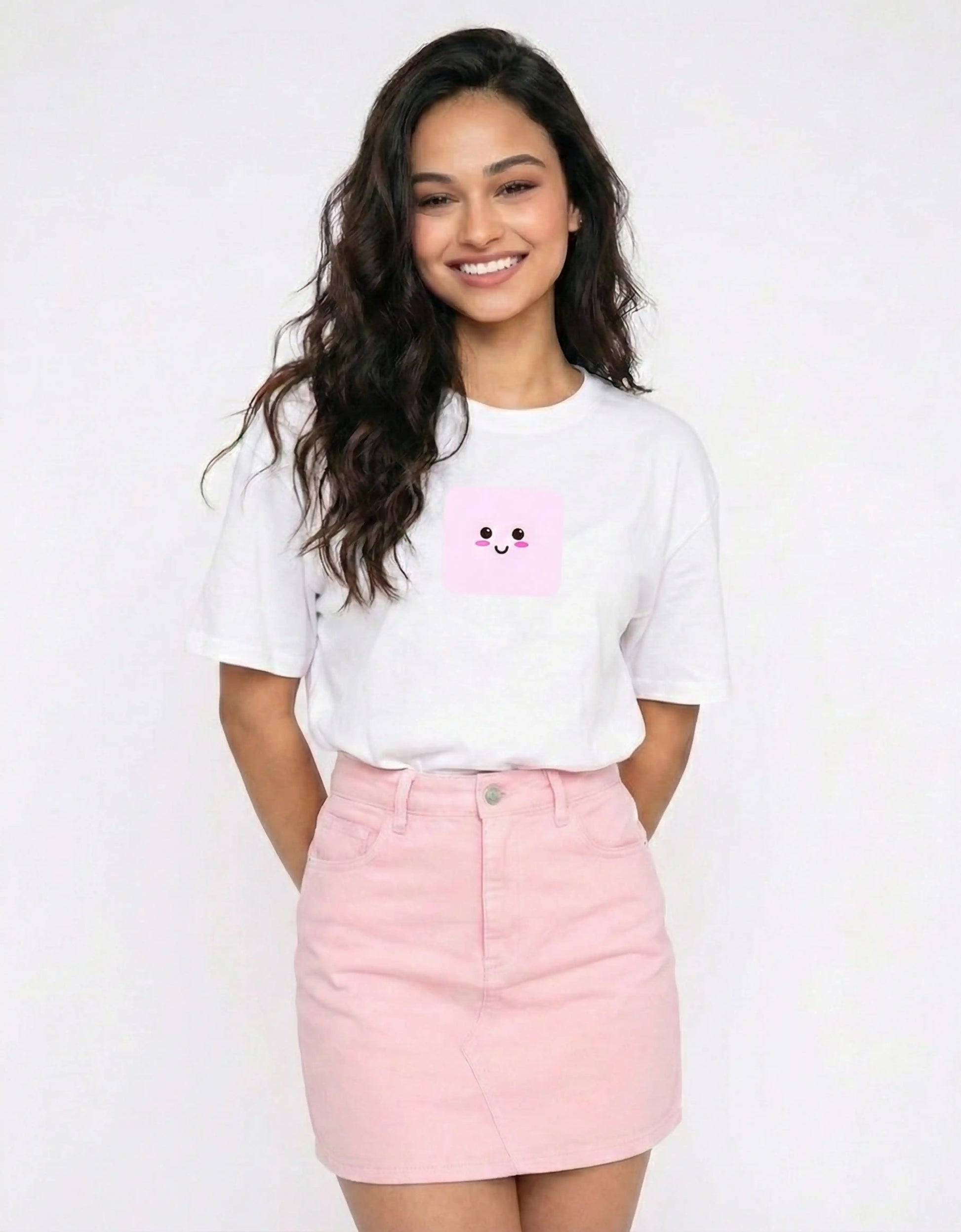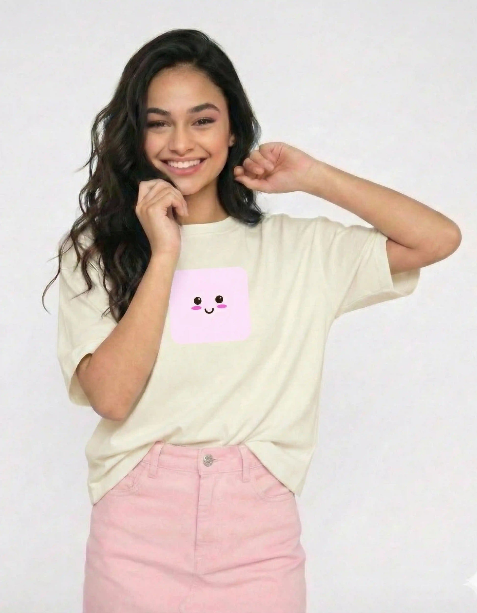 Oversized T-shirt made from 100% cotton, 240 GSM, offering a heavyweight feel while remaining breathable. Designed with a modern oversized silhouette, this tee features a cute minimal emoji face print on the front for a playful, clean aesthetic. The round neckline, dropped shoulders, and relaxed structure ensure effortless everyday comfort with a soft oversized drape.