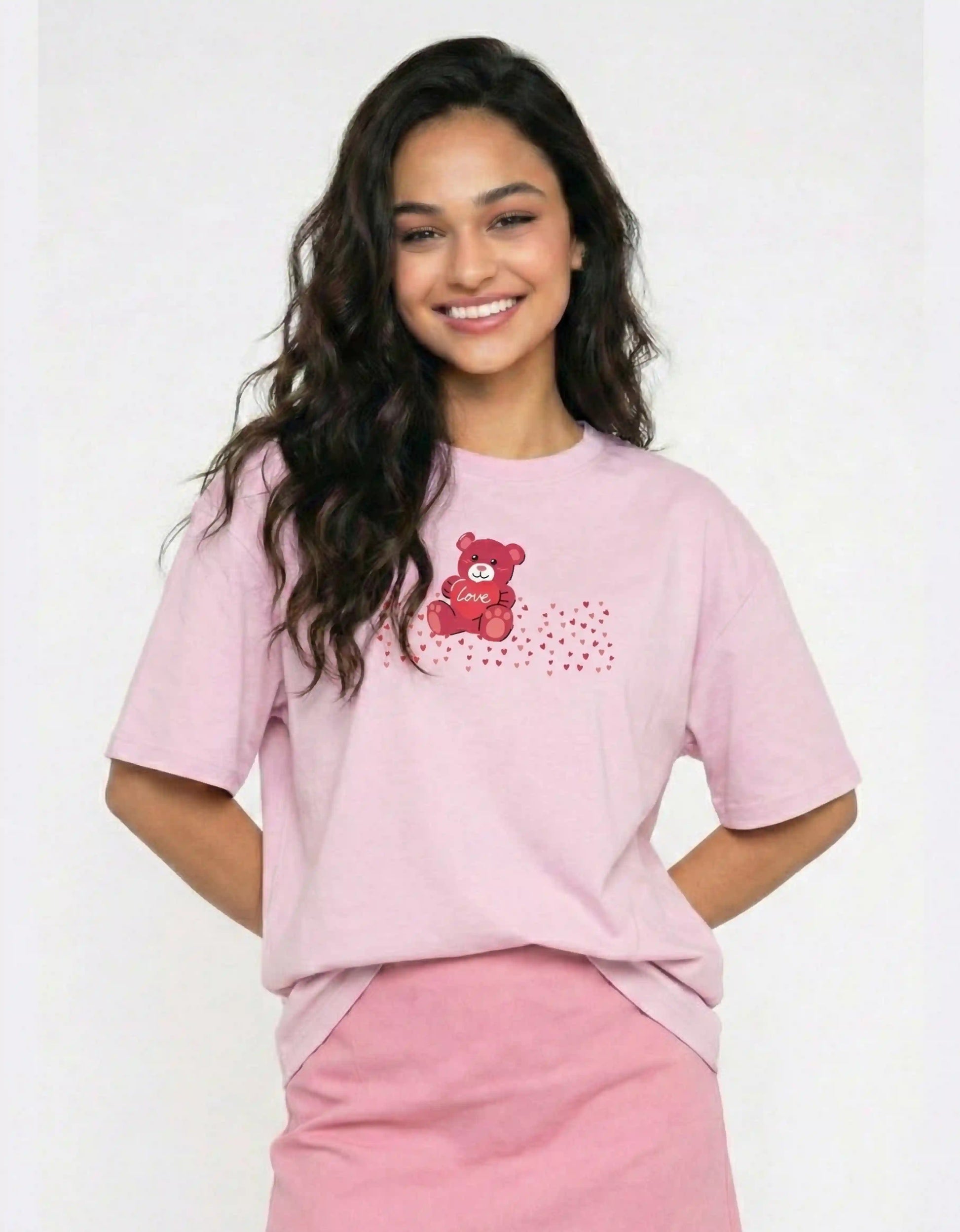 Oversized T-shirt made from 100% premium cotton (240 GSM), offering a soft yet structured feel with a relaxed oversized drape. Designed with a playful teddy bear and heart motif on the front, this tee brings a warm, romantic touch to everyday styling. Finished with a round neckline, dropped shoulders, and a clean oversized silhouette for effortless comfort.