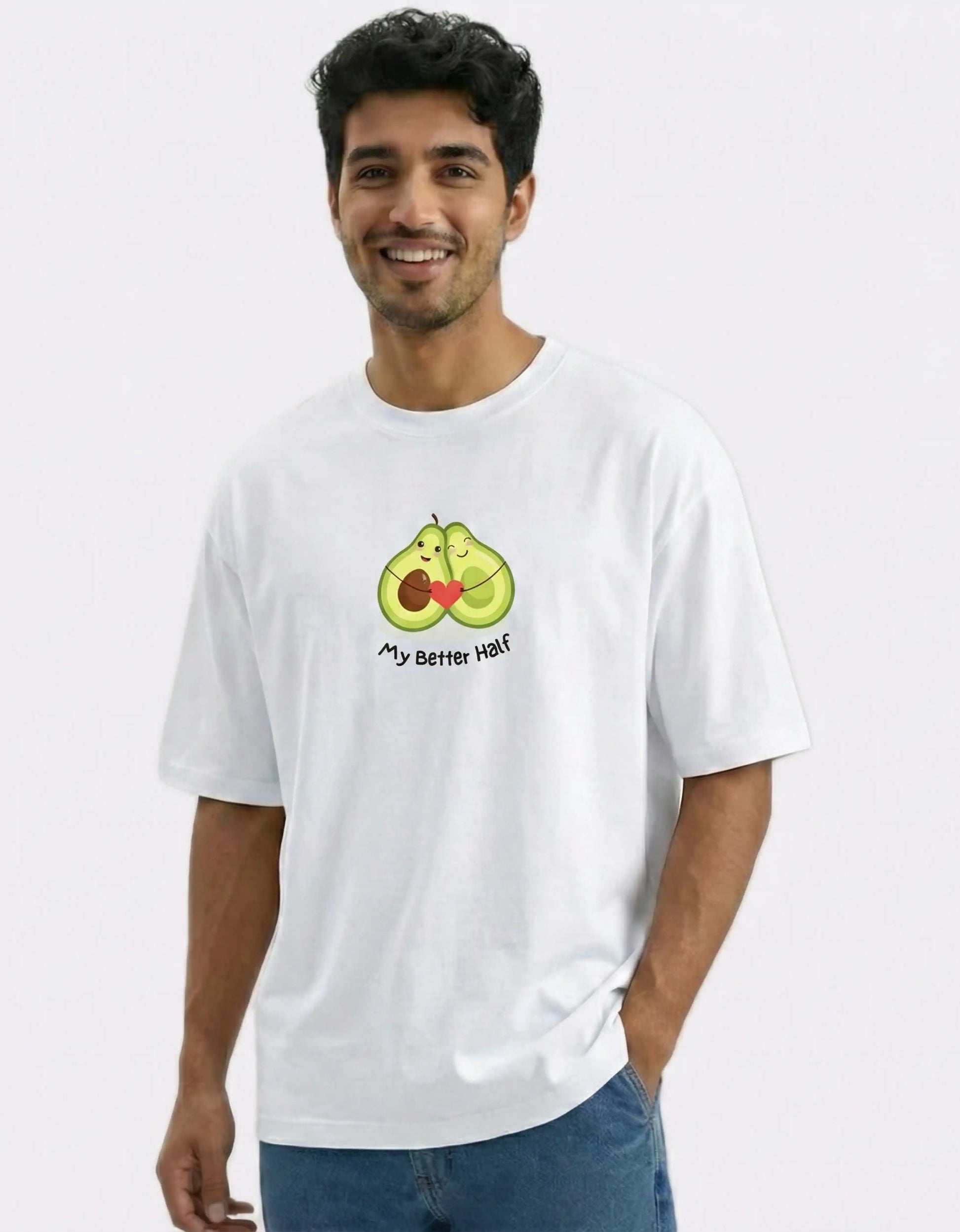 Oversized T-shirt made from 100% cotton, 240 GSM, offering a heavyweight yet breathable feel. Designed with a modern oversized silhouette, this tee features a playful “My Better Half” avocado graphic on the front, symbolising love, balance, and togetherness. The round neckline, dropped shoulders, and relaxed length make it an easy everyday essential with a soft, romantic touch.